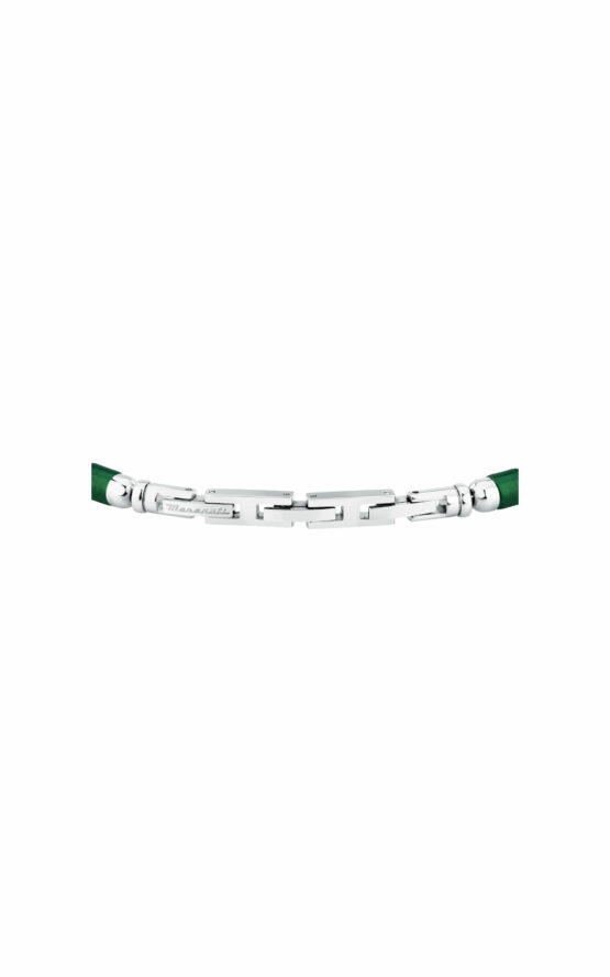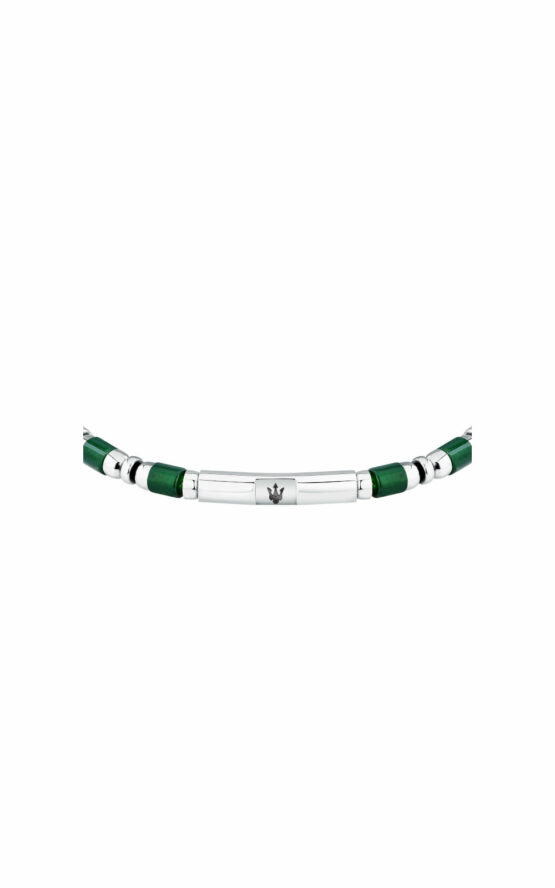 Ανδρικό βραχιόλι MASERATI από ανοξείδωτο ατσάλι. To βραχιόλι είναι ασημένιου χρώματος με πράσινες πέτρες και με λογότυπο της εταιρείας(18,5+3cm).