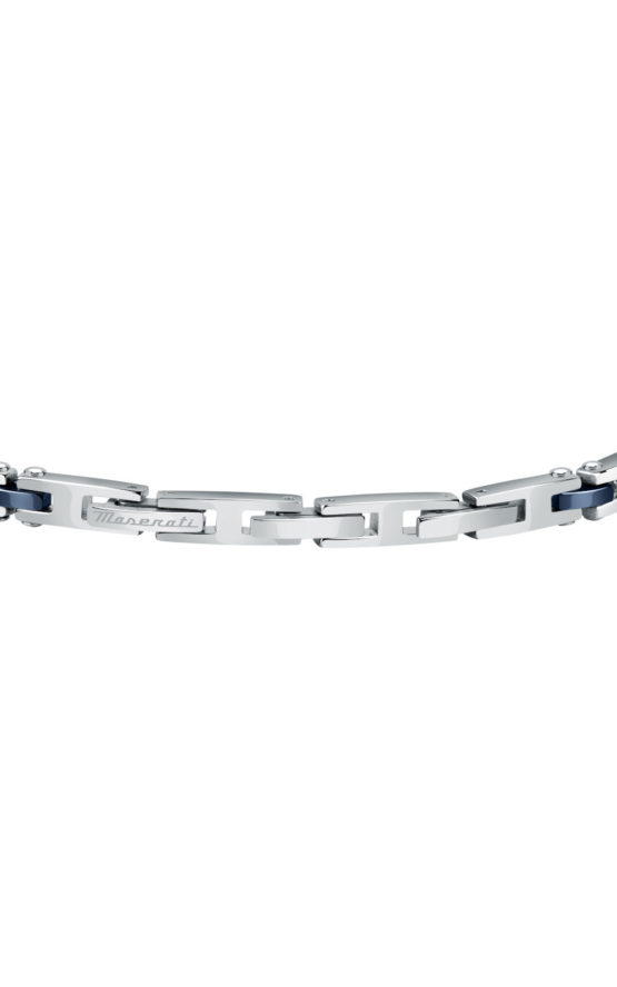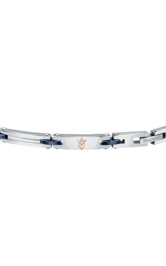 Ανδρικό βραχιόλι MASERATI από ανοξείδωτο ατσάλι. To βραχιόλι είναι ασημένιου και μπλε χρώματος και έχει το λογότυπο της εταιρείας σε ροζ χρυσό χρώμα(22cm).