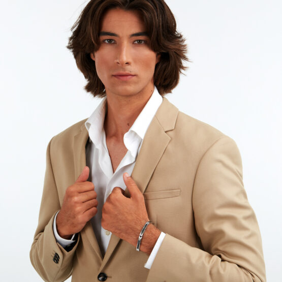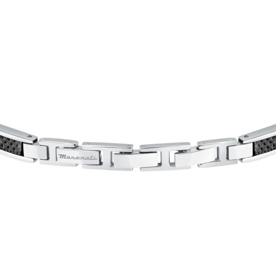 Ανδρικό βραχιόλι MASERATI από ανοξείδωτο ατσάλι. To βραχιόλι είναι ασημένιου και μαύρου χρώματος και έχει χρυσό λογότυπο της εταιρείας(18+3,5cm).