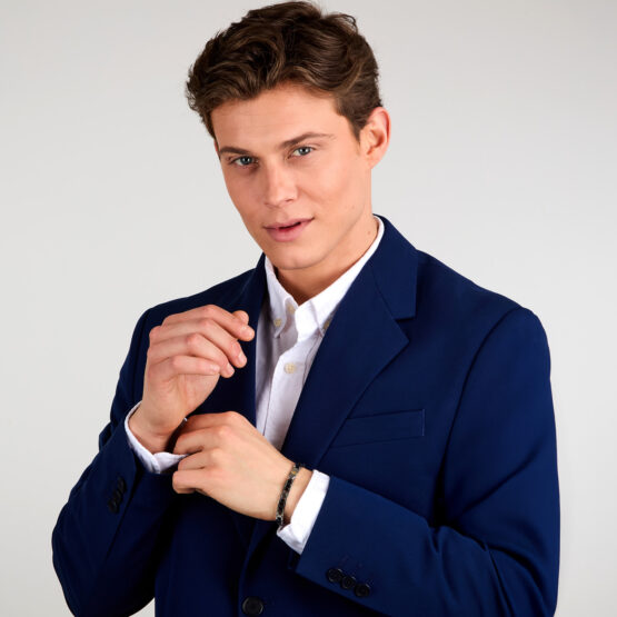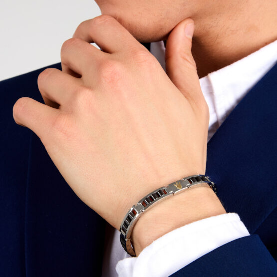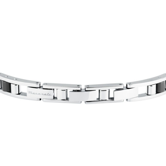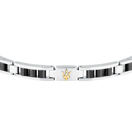 Ανδρικό βραχιόλι MASERATI από ανοξείδωτο ατσάλι με κεραμικά στοιχεία. To βραχιόλι είναι μαύρου και ασημένιου χρώματος με σχέδιο χρυσή τρίαινα και λογότυπο της εταιρείας(18+3,5cm).