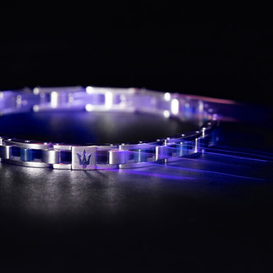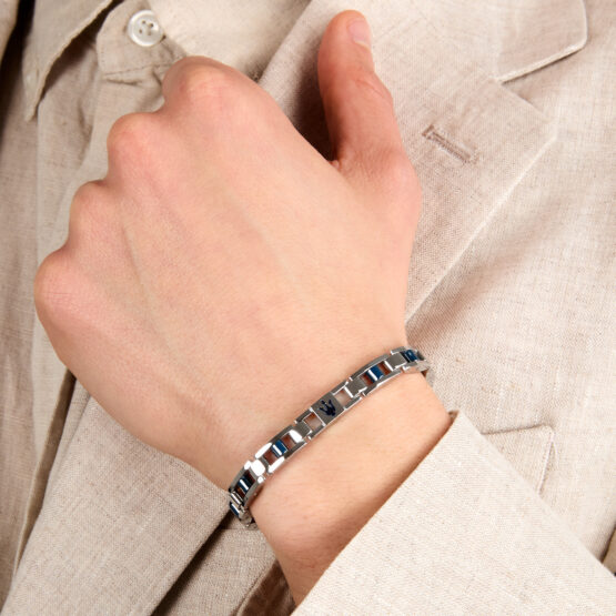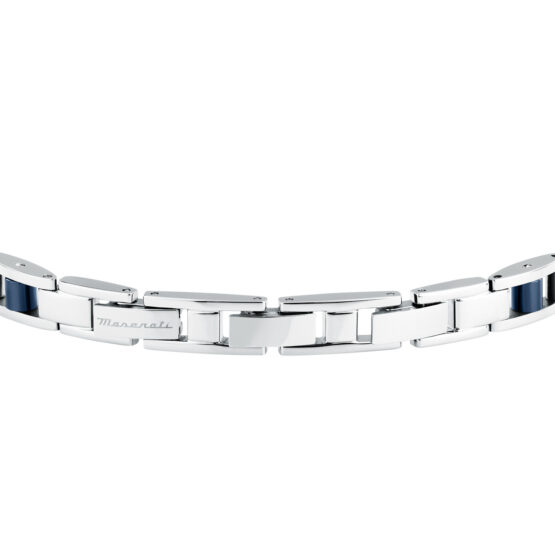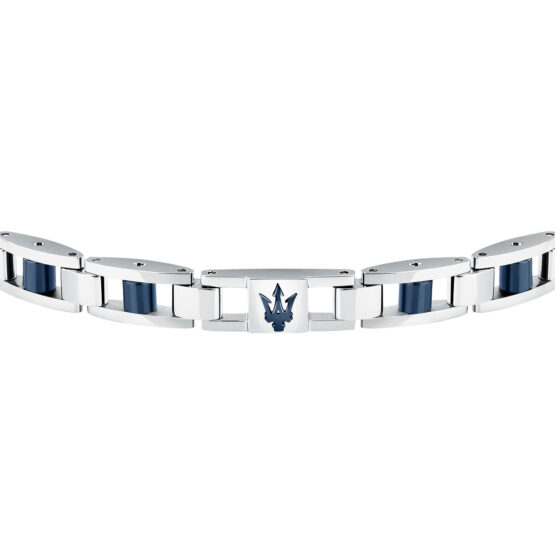 Ανδρικό βραχιόλι MASERATI από ανοξείδωτο ατσάλι με κεραμικά στοιχεία. To βραχιόλι είναι μπλε και ασημένιου χρώματος με σχέδιο μπλε τρίαινα και λογότυπο της εταιρείας(18+3,5cm).