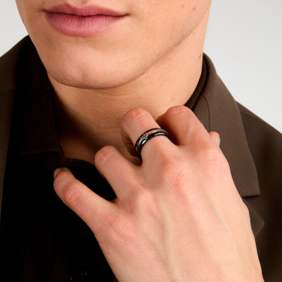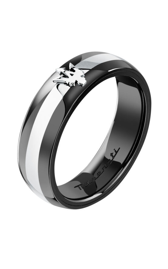 Δαχτυλίδι MASERATI σε ασημί και μαύρο χρώμα με κεραμικά στοιχεία. Είναι κατασκευασμένο από ανοξείδωτο ατσάλι.