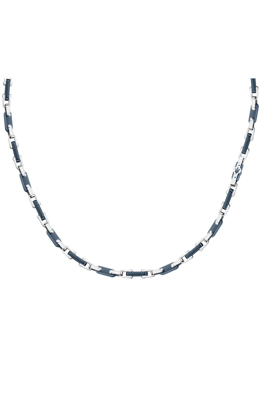 Ανδρικό κολιέ MASERATI από ανοξείδωτο ατσάλι με κεραμικά στοιχεία. To κολιέ είναι ασημένιου χρώματος με λογότυπο της εταιρείας και μαύρες λεπτομέρειες(50+5cm).
