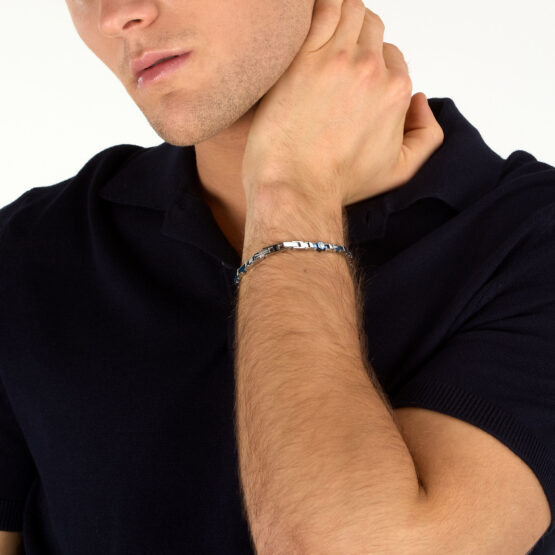 Ανδρικό βραχιόλι MASERATI από ανοξείδωτο ατσάλι και κεραμικό. To βραχιόλι είναι ασημένιου και μπλε χρώματος, με ασημί τρίαινα(18+3,5cm).