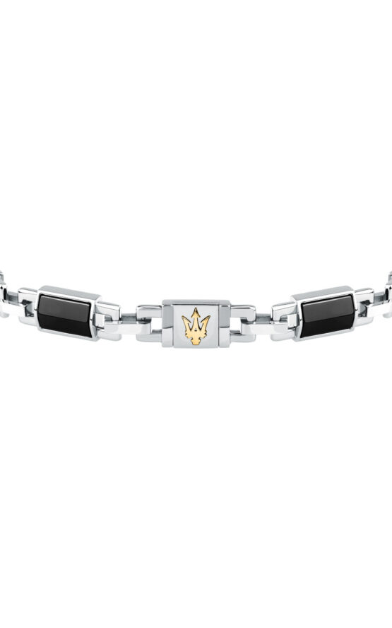 Ανδρικό βραχιόλι MASERATI από ανοξείδωτο ατσάλι με κεραμικά στοιχεία. To βραχιόλι είναι μαύρου και ασημένιου χρώματος με σχέδιο χρυσή τρίαινα(18+3,5cm).