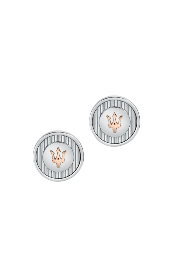 Μανικετόκουμπα MASERATI ICONIC JM121ATK14 από ανοξείδωτο ατσάλι ασημένιου χρώματος με ροζ επίχρυσες λεπτομέρειες και λογότυπο.