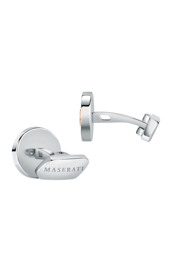 Μανικετόκουμπα MASERATI ασημένιου χρώματος με ροζ επίχρυσες λεπτομέρειες. Είναι κατασκευασμένα από ανοξείδωτο ατσάλι και έχουν το λογότυπο της εταιρείας.