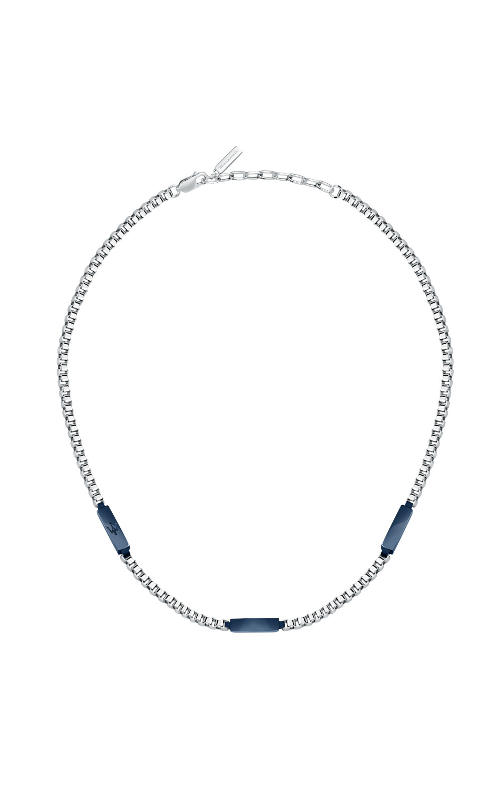 Ανδρικό κολιέ MASERATI από ανοξείδωτο ατσάλι. To κολιέ είναι ασημένιου χρώματος με λογότυπο της εταιρείας και μπλε λεπτομέρειες(45+5cm).