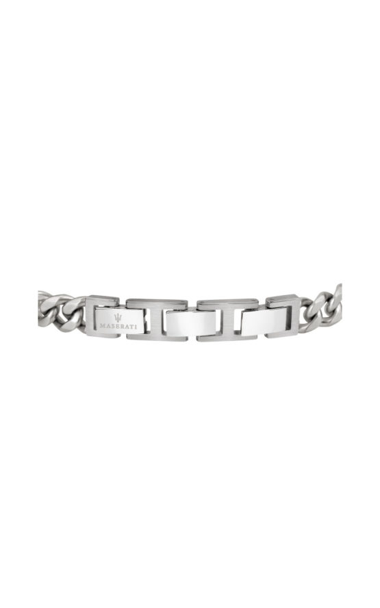 Ανδρικό βραχιόλι MASERATI από ανοξείδωτο ατσάλι. To βραχιόλι είναι ασημένιου χρώματος με μαύρο λογότυπο της εταιρείας.