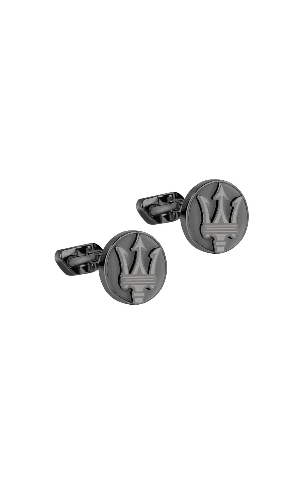 Μανικετόκουμπα MASERATI μαύρου χρώματος με ανθρακί λεπτομέρειες. Είναι κατασκευασμένα από ανοξείδωτο ατσάλι και έχουν το λογότυπο της εταιρείας.