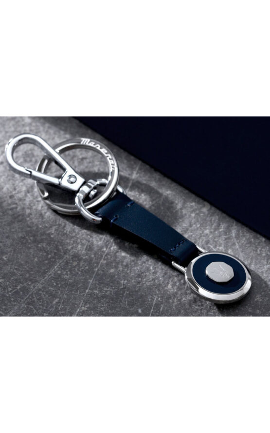 Μπρελόκ MASERATI KEYRING KMU5240102 μπλε χρώματος με λογότυπο της εταιρείας, κατασκευασμένο από ανοξείδωτο ατσάλι.