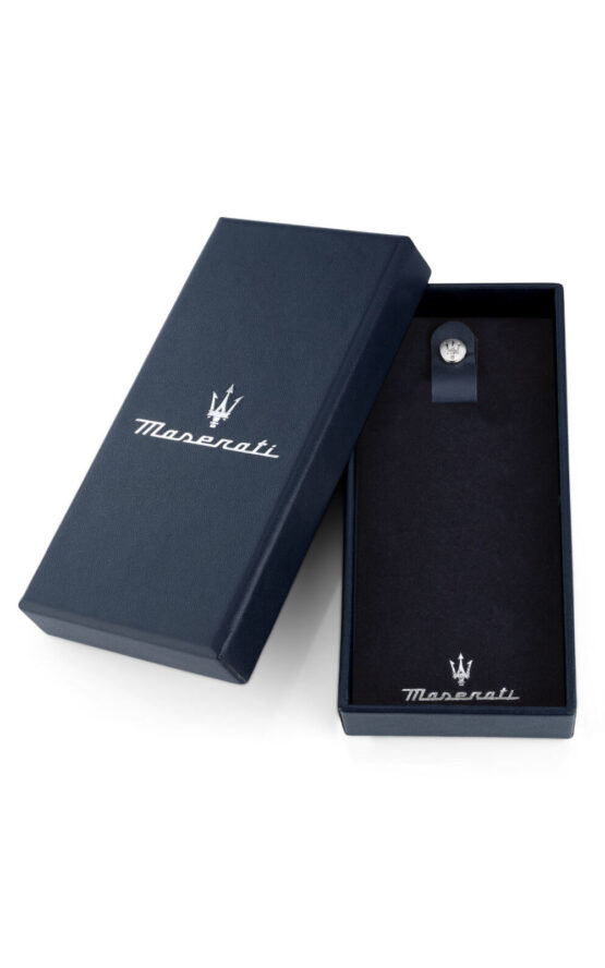 Μπρελόκ MASERATI μπλε χρώματος από ανοξείδωτο ατσάλι. Το μπρελόκ έχει το λογότυπο της εταιρείας.
