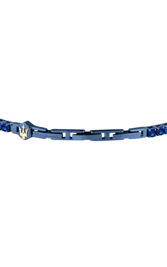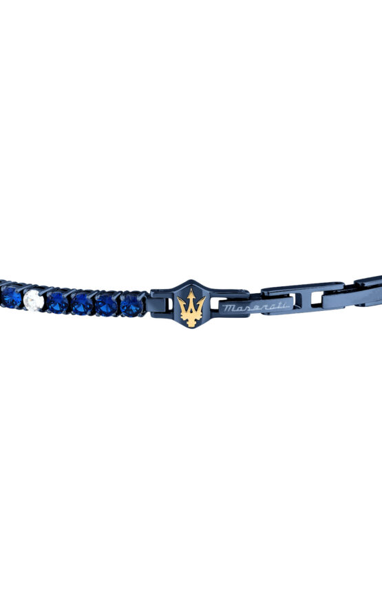 Ανδρικό βραχιόλι MASERATI από ανοξείδωτο ατσάλι. To βραχιόλι είναι μπλε χρώματος με πέτρες, χρυσή τρίαινα και λογότυπο της εταιρείας(18+3,5cm).