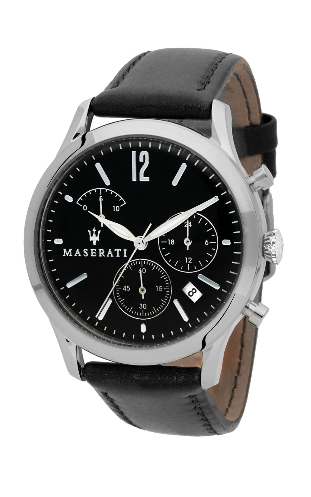 Ανδρικό ρολόι MASERATI R8871625002 διαμέτρου 42mm, με μηχανισμό Quartz χρονογράφου ακριβείας, μαύρο καντράν, κάσα από ανοξείδωτο ατσάλι και μαύρο δερμάτινο λουράκι.