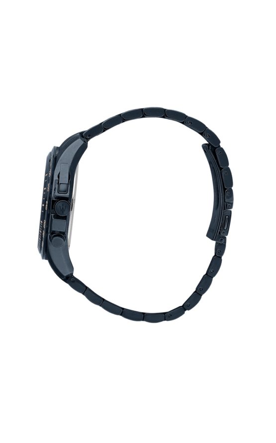 Ανδρικό ρολόι διαμέτρου 45mm, με μηχανισμό Quartz χρονογράφου ακριβείας. Έχει μπλε καντράν με ροζ επίχρυσους δείκτες, λεπτομέρειες και ένδειξη ημερομηνίας. Η κάσα του είναι μπλε χρώματος από ανοξείδωτο ατσάλι με κρύσταλλο από ορυκτό κρύσταλλο ειδικής σκλήρυνσης. Έχει μπλε μπρασελέ από ανοξείδωτο ατσάλι με κούμπωμα ασφαλείας. Είναι αδιάβροχο (10 ATM).