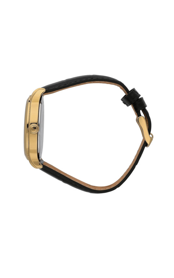 Ανδρικό ρολόι διαμέτρου 42mm, με μηχανισμό Quartz ακριβείας. Έχει λευκό καντράν με επίχρυσους χρυσούς δείκτες και λεπτομέρειες και ένδειξη ημερομηνίας. Η κάσα του είναι επίχρυση από ανοξείδωτο ατσάλι με κρύσταλλο από ορυκτό κρύσταλλο ειδικής σκλήρυνσης. Έχει δερμάτινο κροκό λουράκι μαύρου χρώματος και κούμπωμα τοκάς. Είναι αδιάβροχο (10 ATM).