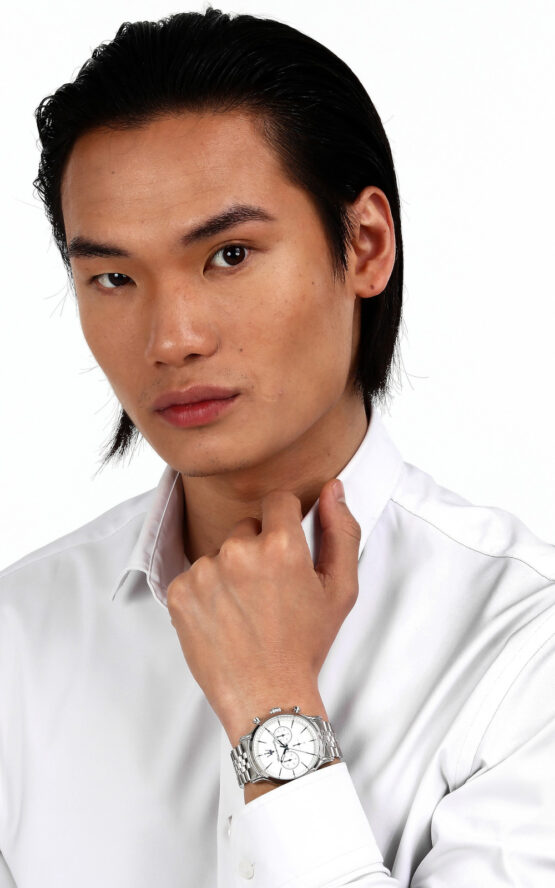 Ανδρικό ρολόι EPOCA R8873618034 διαμέτρου 42mm, με μηχανισμό Quartz χρονογράφο ακριβείας, λευκό καντράν και κάσα από ανοξείδωτο ατσάλι, ασημένιο μπρασελέ από ανοξείδωτο ατσάλι.