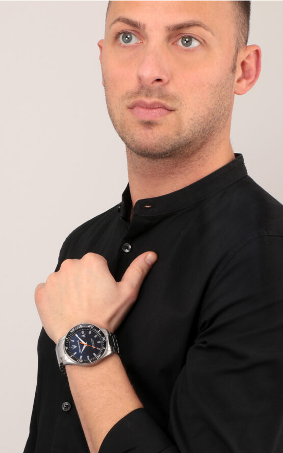 Ανδρικό ρολόι διαμέτρου 44mm με μηχανισμό Quartz ακριβείας. Έχει δίχρωμο καντράν, μπλε και μαύρο με ασημένιους δείκτες και ένδειξη ημερομηνίας. Η κάσα του είναι από ανοξείδωτο ατσάλι με κρύσταλλο από ορυκτό κρύσταλλο ειδικής σκλήρυνσης. Έχει μπρασελέ από ανοξείδωτο ατσάλι με κούμπωμα ασφαλείας. Είναι αδιάβροχο (10 ATM).