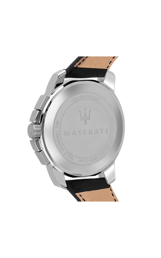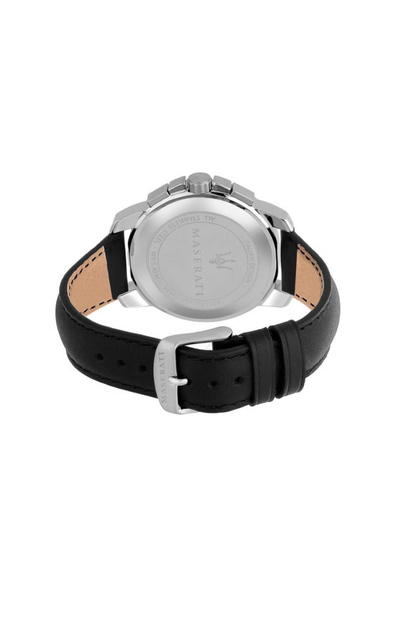 Ανδρικό ρολόι MASERATI R8871621008 διαμέτρου 44mm, με μηχανισμό Quartz Multi-Function ακριβείας, έχει γκρι καντράν, κάσα από ανοξείδωτο ατσάλι και μαύρο δερμάτινο λουράκι.