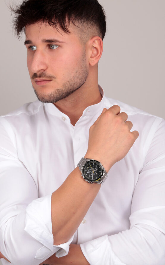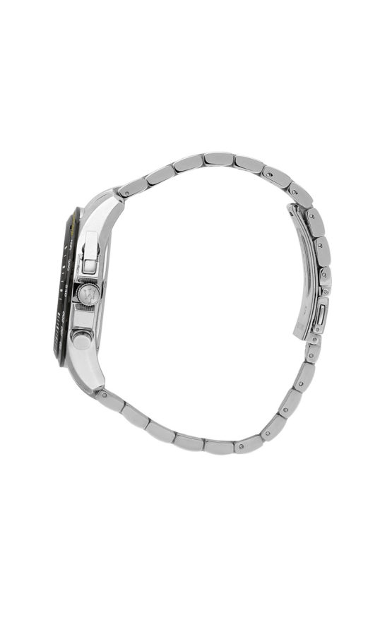 Ανδρικό ρολόι διαμέτρου 45mm, με μηχανισμό QUARTZ χρονογράφου ακριβείας. Έχει μαύρο καντράν με ασημένιους δείκτες, λεπτομέρειες και ένδειξη ημερομηνίας. Η κάσα του είναι από ανοξείδωτο ατσάλι με κρύσταλλο από ορυκτό κρύσταλλο ειδικής σκλήρυνσης. Έχει μπρασελέ από ανοξείδωτο ατσάλι με κούμπωμα ασφαλείας. Είναι αδιάβροχο (10 ΑΤΜ).