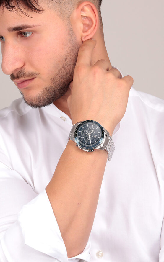 Ανδρικό ρολόι διαμέτρου 45mm, με μηχανισμό QUARTZ χρονογράφου ακριβείας. Έχει μπλε καντράν με ασημένιους δείκτες, λεπτομέρειες και ένδειξη ημερομηνίας. Η κάσα του είναι από ανοξείδωτο ατσάλι με μπλε λεπτομέρειες και κρύσταλλο από ορυκτό κρύσταλλο ειδικής σκλήρυνσης. Έχει μπρασελέ από ανοξείδωτο ατσάλι με κούμπωμα ασφαλείας. Είναι αδιάβροχο (10 ΑΤΜ).