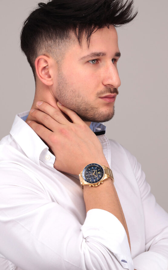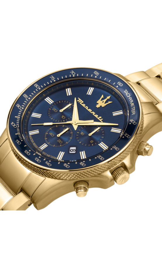 Ανδρικό ρολόι MASERATI SFIDA R8873640008 διαμέτρου 44mm, με μηχανισμό QUARTZ χρονογράφου ακριβείας, μπλε καντράν, κάσα και μπρασελέ από ανοξείδωτο ατσάλι.