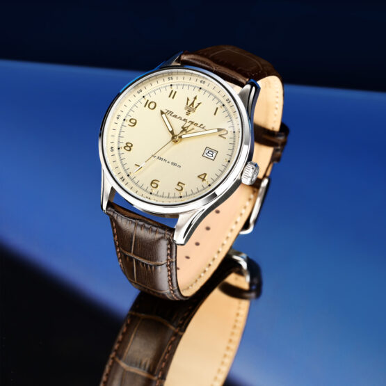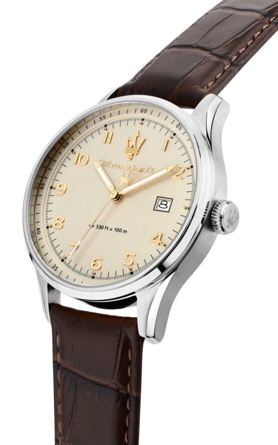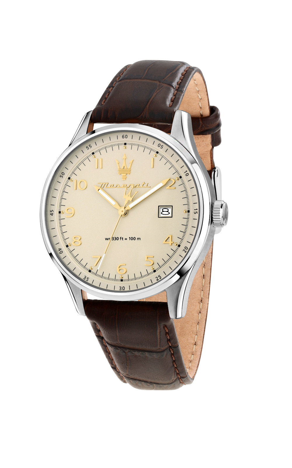 Ανδρικό ρολόι MASERATI SORPASSO R8851124004 διαμέτρου 42mm, με μηχανισμό Quartz Ακριβείας, μπεζ καντράν, κάσα από ανοξείδωτο ατσάλι και δερμάτινο λουράκι.