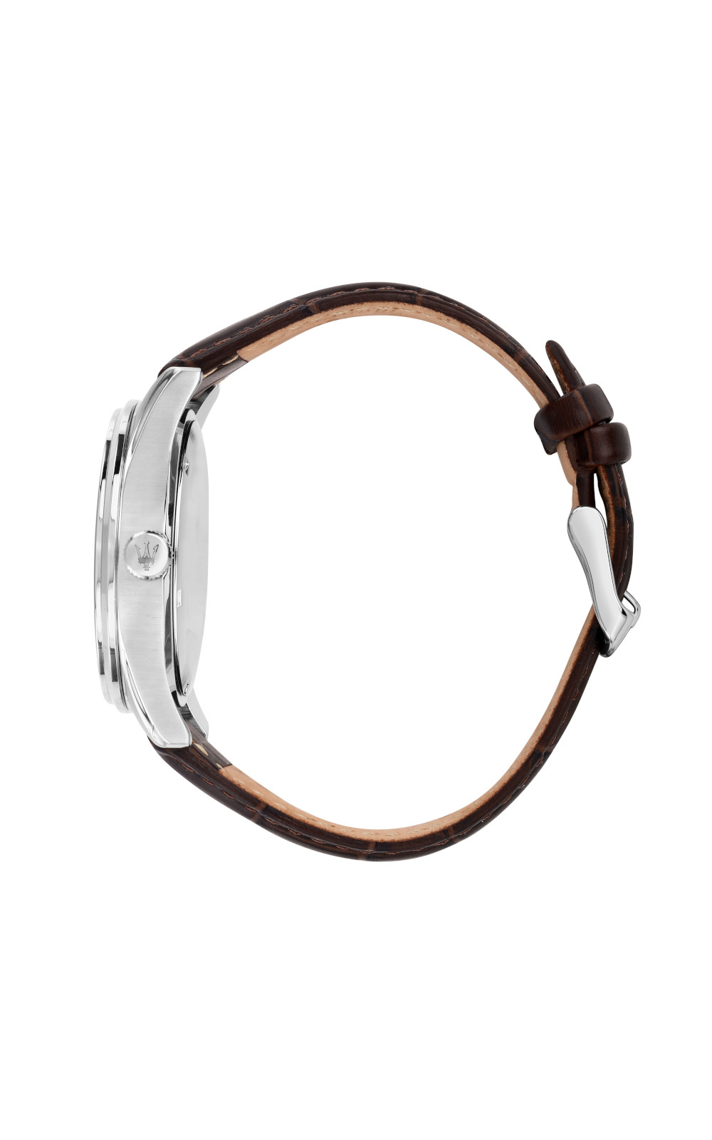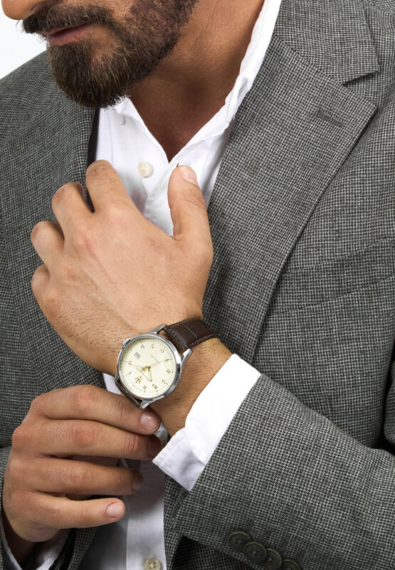 Ανδρικό ρολόι διαμέτρου 42mm με μηχανισμό Quartz Ακριβείας. Έχει μπεζ καντράν με χρυσούς δείκτες. Η κάσα του είναι ασημένια από ανοξείδωτο ατσάλι και κρύσταλλο από ορυκτό κρύσταλλο. Έχει δερμάτινο λουράκι και κούμπωμα τοκάς. Είναι αδιάβροχο (10 ΑΤΜ).