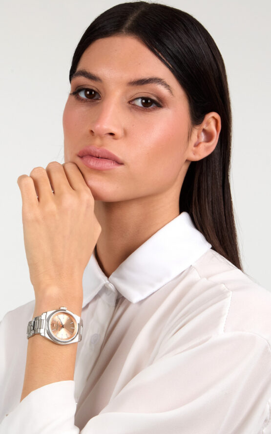 Γυναικείο ρολόι διαμέτρου 35mm με μηχανισμό QUARTZ ακριβείας. Έχει ροζ χρυσό καντράν,δείκτες και λεπτομέρειες. Η κάσα του είναι από ανοξείδωτο ατσάλι με κρύσταλλο από ορυκτό κρύσταλλο ειδικής σκλήρυνσης. Έχει ασημί μπρασελέ από ανοξείδωτο ατσάλι και κούμπωμα ασφαλείας. Είναι αδιάβροχο (5 ΑΤΜ).