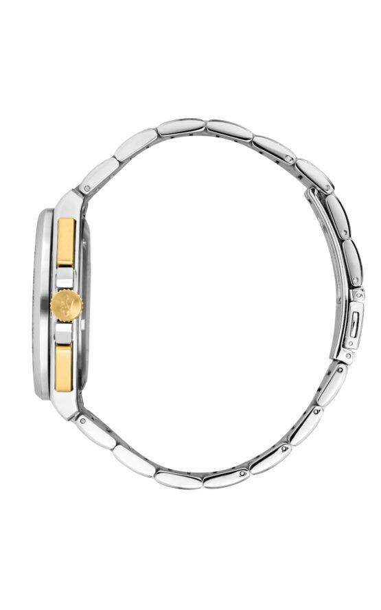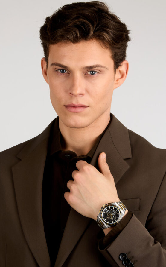 Ανδρικό ρολόι Quartz χρονογράφος ακριβείας διαμέτρου 43mm. Έχει μαύρο καντράν με χρυσούς δείκτες, και λεπτομέρειες. Η κάσα του είναι από ανοξείδωτο ατσάλι με κρύσταλλο από ορυκτό κρύσταλλο. Έχει μπρασελέ από ανοξείδωτο ατσάλι και κούμπωμα ασφαλείας. Είναι αδιάβροχο (10 ATM).