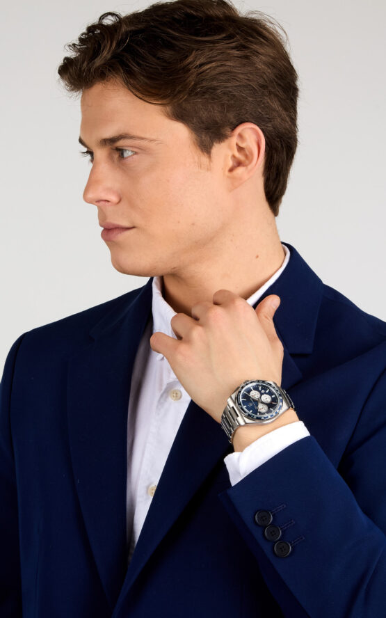 Ανδρικό ρολόι Quartz χρονογράφος ακριβείας διαμέτρου 43mm. Έχει μπλε καντράν με ασημένιους δείκτες, και λεπτομέρειες. Η κάσα του είναι από ανοξείδωτο ατσάλι με κρύσταλλο από ορυκτό κρύσταλλο. Έχει μπρασελέ από ανοξείδωτο ατσάλι και κούμπωμα ασφαλείας. Είναι αδιάβροχο (10 ATM).