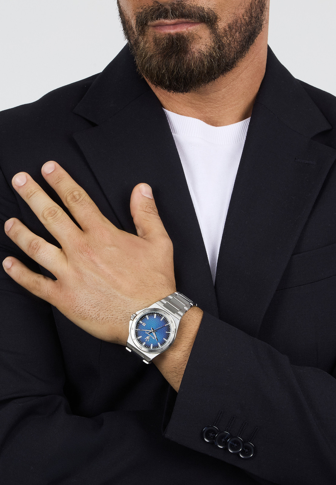 Ανδρικό ρολόι διαμέτρου 40mm με μηχανισμό Quartz Ακριβείας. Έχει μπλε καντράν με ασημένιους δείκτες. Η κάσα του είναι ασημένια από ανοξείδωτο ατσάλι και κρύσταλλο από ορυκτό κρύσταλλο. Έχει μπρασελέ από ανοξείδωτο ατσάλι και κούμπωμα ασφαλείας. Είναι αδιάβροχο (5 ΑΤΜ).