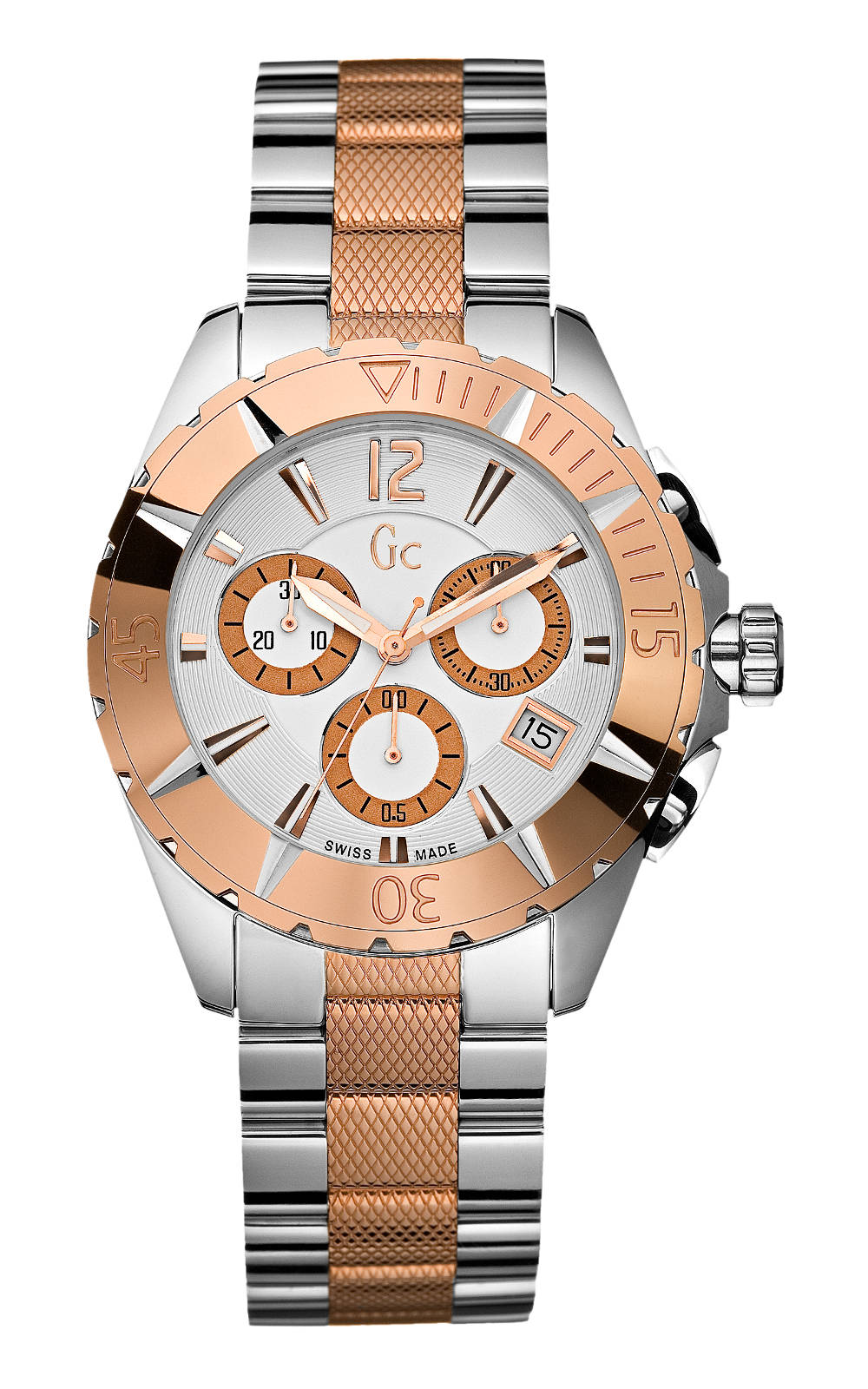 Αντρικό ρολόι GC I47006M1 διαμέτρου 39mm, με μηχανισμό Quartz χρονογράφος ακριβείας, λευκό καντράν, κάσα – μπρασελέ από ανοξείδωτο ατσάλι με ροζ επίχρυσες λεπτομέρειες.