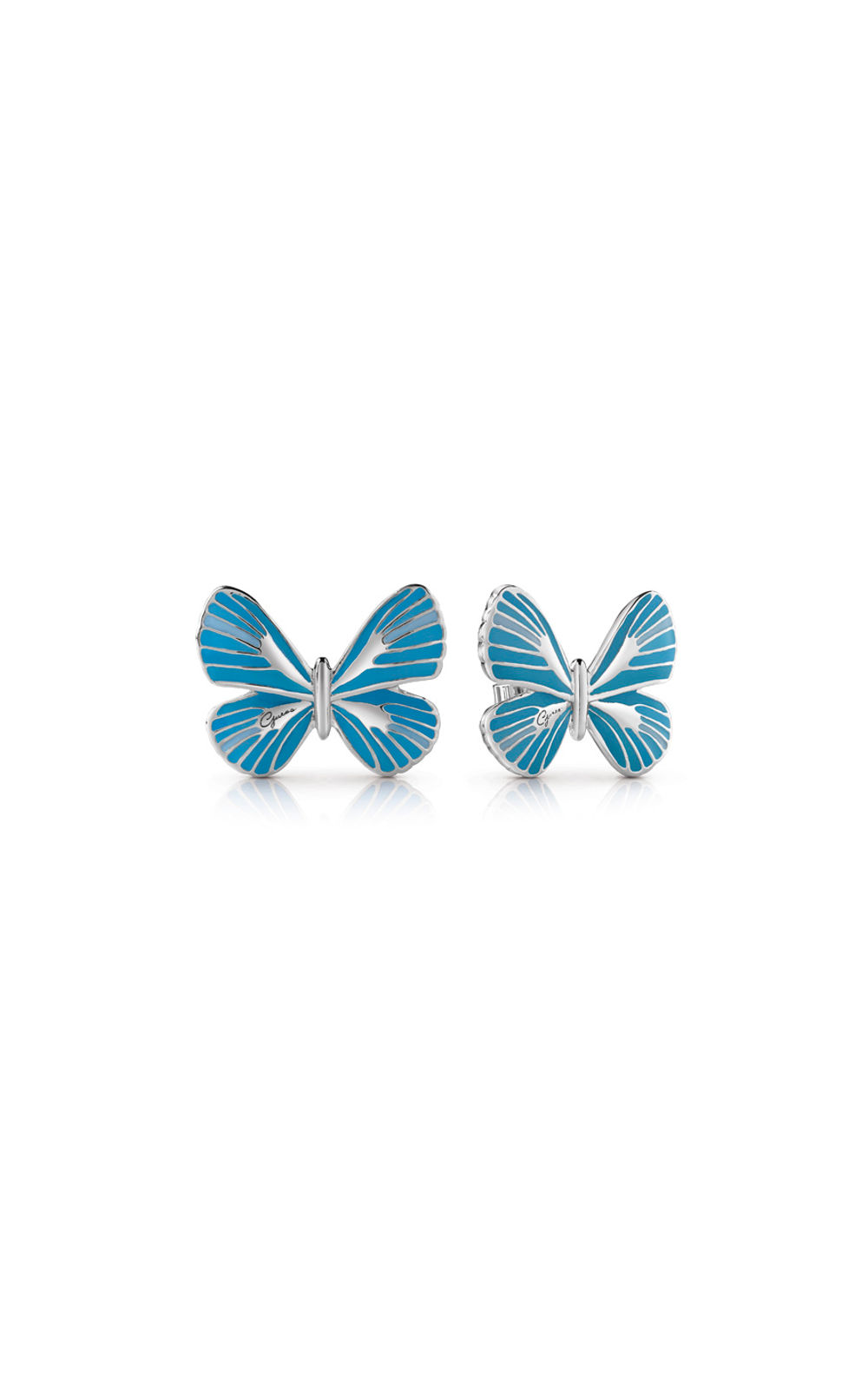Γυναικεία σκουλαρίκια GUESS FAUX ασημένιου χρώματος με μπλε πεταλούδα. Έχουν το λογότυπο της εταιρείας.