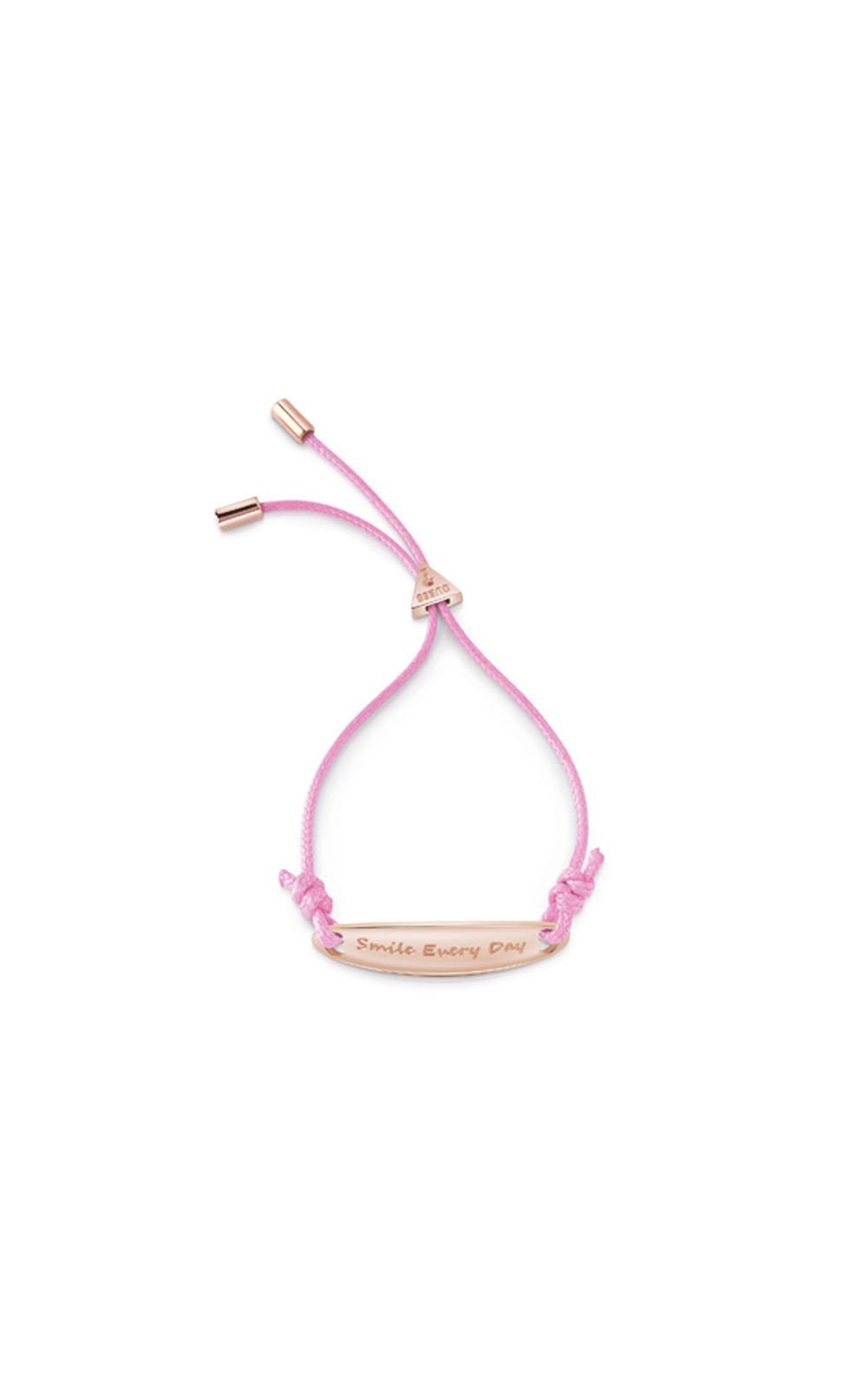 Γυναικείο βραχιόλι GUESS STEEL SEA BREEZE UBB85044-L ροζ χρυσού χρώματος με ροζ κορδόνι, σχέδιο Smile Every Day και λογότυπο της εταιρείας(6,1×5,1cm).