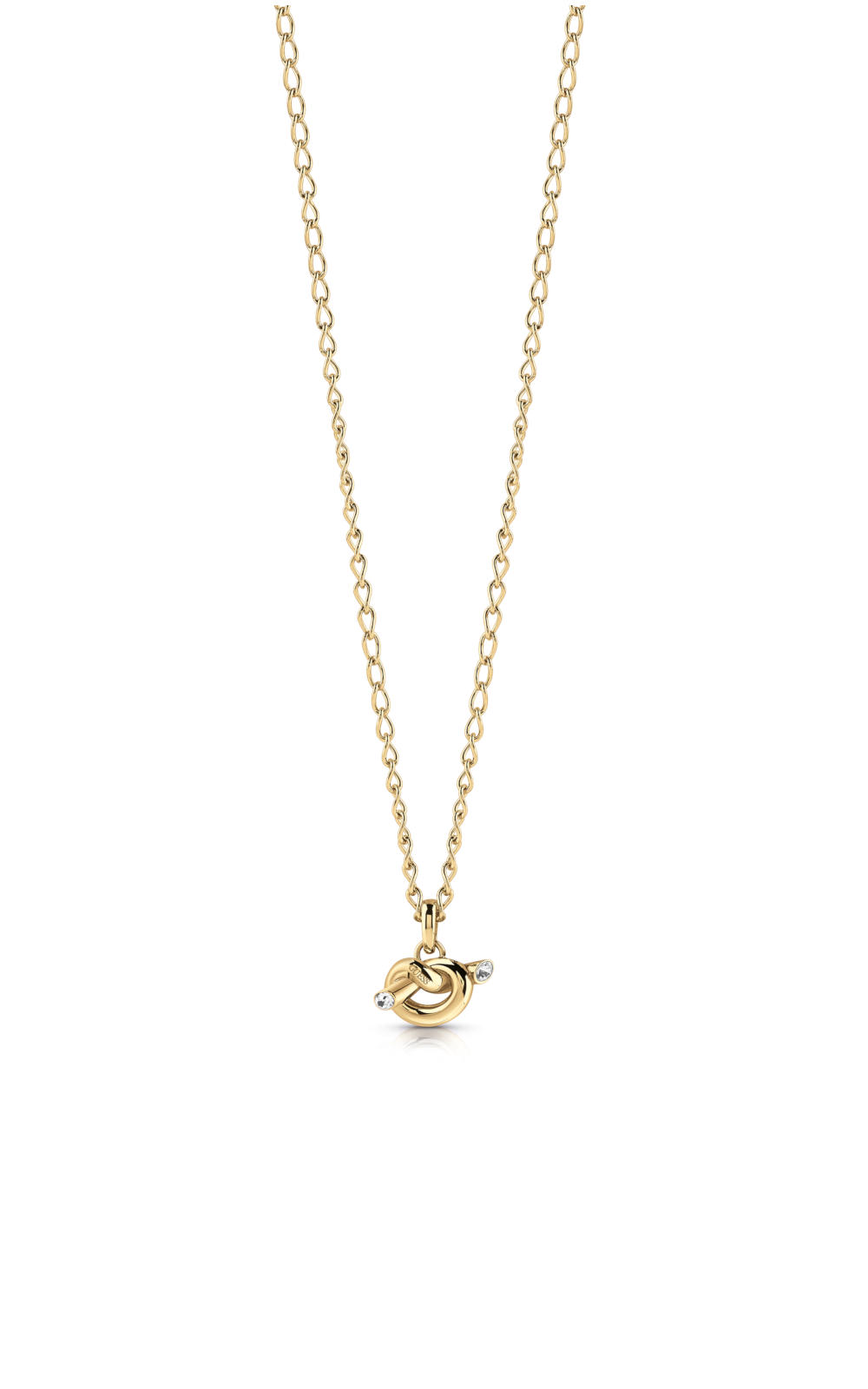 Γυναικείο κολιέ GUESS STEEL GUESS KNOT UBN29019 χρυσού χρώματος με μικρό κόμπο, λογότυπο της εταιρείας και διαφανείς πέτρες ζιργκόν(45,72-50,8cm).