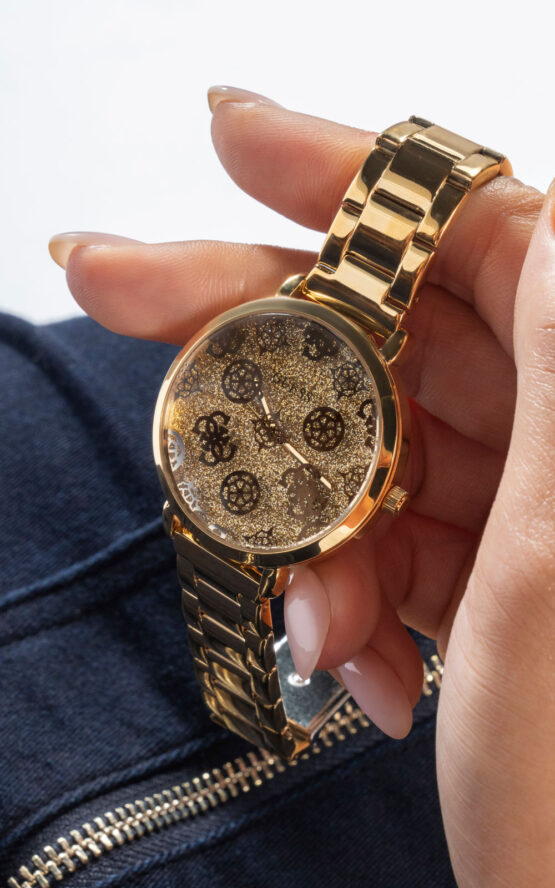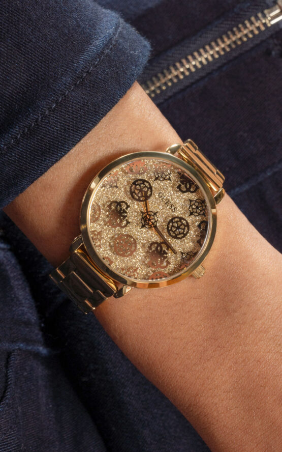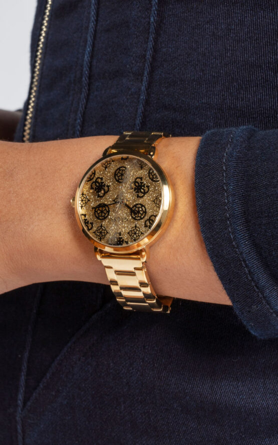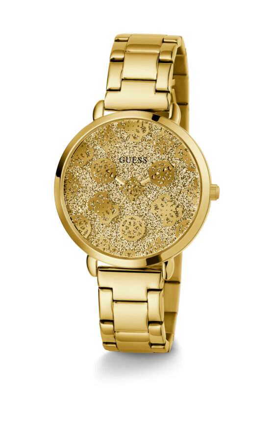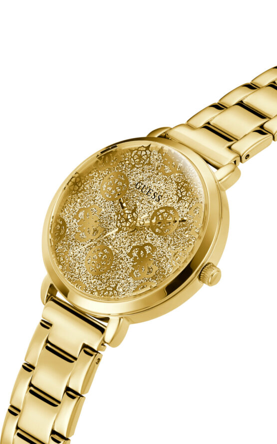 Γυναικείο ρολόι GUESSSUGARPLUM GW0670L2 διαμέτρου 38mm, με μηχανισμό QUARTZ ακριβείας, επίχρυσό καντράν, κάσα και μπρασελέ από ανοξείδωτο ατσάλι.