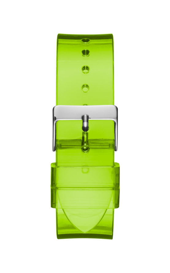 Γυναικείο ρολόι διαμέτρου 42mm με μηχανισμό QUARTZ ακριβείας. Έχει λευκό καντράν με ασημένιους δείκτες και πράσινο τρίγωνο guess. Η κάσα του είναι πλαστική πράσινου χρώματος με κρύσταλλο από ορυκτό κρύσταλλο ειδικής σκλήρυνσης. Έχει διαφανές λουράκι σιλικόνης πράσινου χρώματος με κούμπωμα τοκάς.