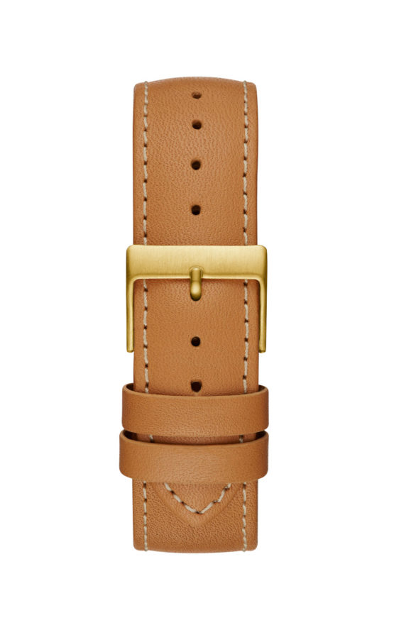 Γυναικείο ρολόι GUESS KENNEDY W1068L4 διαμέτρου 41mm, με μηχανισμό QUARTZ ακριβείας, επίχρυσο καντράν, επίχρυση κάσα από ανοξείδωτο ατσάλι και καφέ δερμάτινο λουράκι.